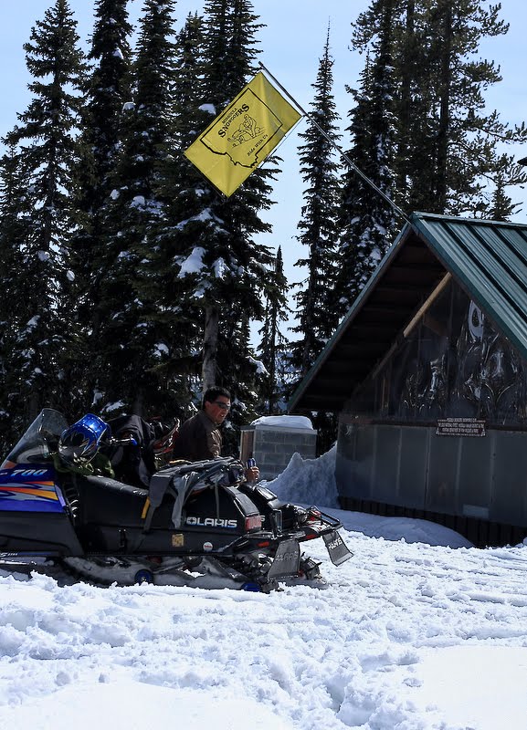 A buddy and I got to take advantage of one of the seemingly "every other day(s)" of sunshine (alternating stormy/sunny) we've been getting lately. With blue skies and unseasonably warm temps in the forecast we got a noonish start and headed for Lolo Pass. The lot was loaded with snowmobile trailers, everyone seemed to be thinking the same thing....lets drink some beer and sled.